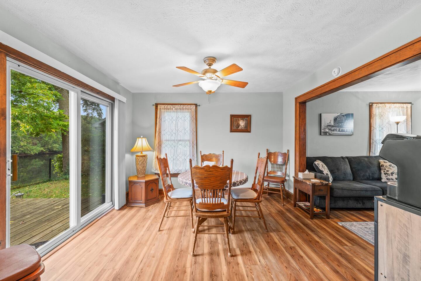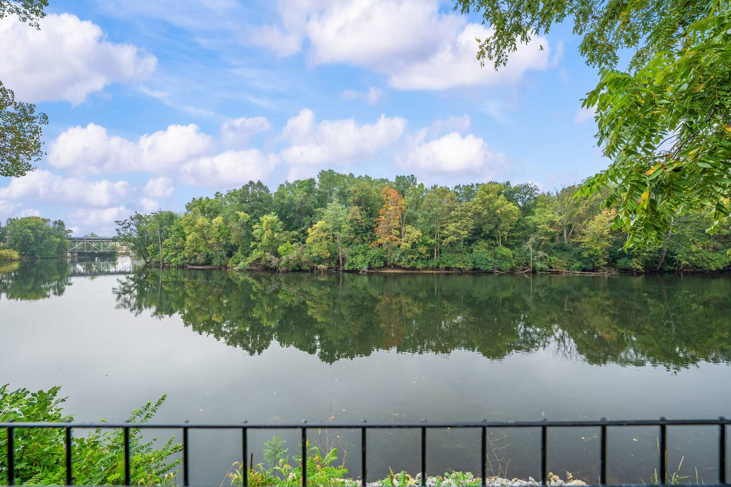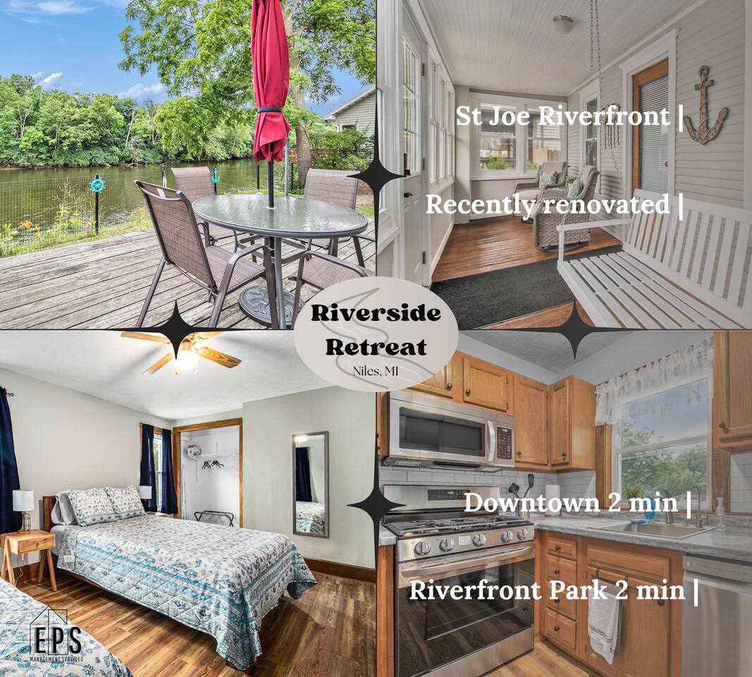 Experience Riverfront views right from the backyard at Riverside Retreat! → 9 min to the Morris Estate → 20 min to Notre Dame → Walk to Downtown Niles, YMCA, & Parks → Fast Wifi → Central AC + heat